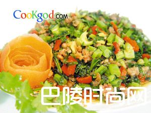 主料:雪里红(3棵)、猪绞肉(3两)、红辣椒(1根)、葱(1根)调料:油(3汤匙)、酱油(1/6汤匙)、料酒(1/6汤匙)、盐(1/8汤匙)、鸡精(1/5汤匙)