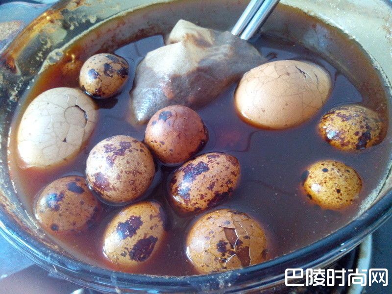 5将刚刚捞出的蛋,用汤匙尽量敲出均匀的龟裂,置入卤锅中,小火卤30分钟后熄火焖著冷却(这个过程也可以使用电锅完成)