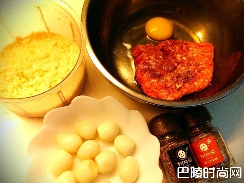 1将鴳鹑蛋煮熟后,包入混合所有调味料的绞肉中再用面包粉沾外层