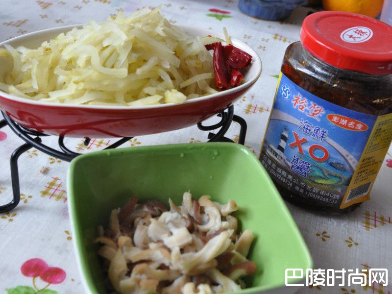 3再准备榨菜丝、辣椒段、猪肚丝、XO酱等备料