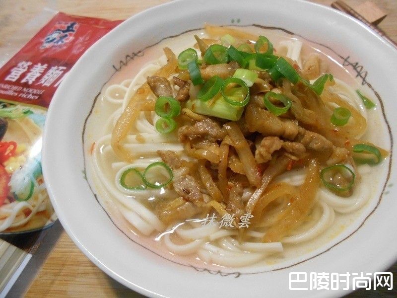 9面放一些青菜和炒好的榨菜肉丝,淋上高汤撒一些葱花就完成了