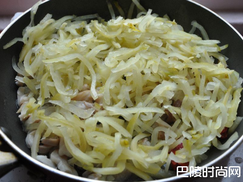 6接着放入榨菜丝热炒搅拌