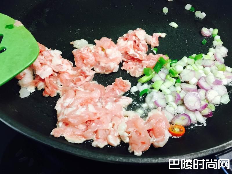 2热锅放入葱蒜放入爆香,再加入猪肉丝拌炒一下捞起备用