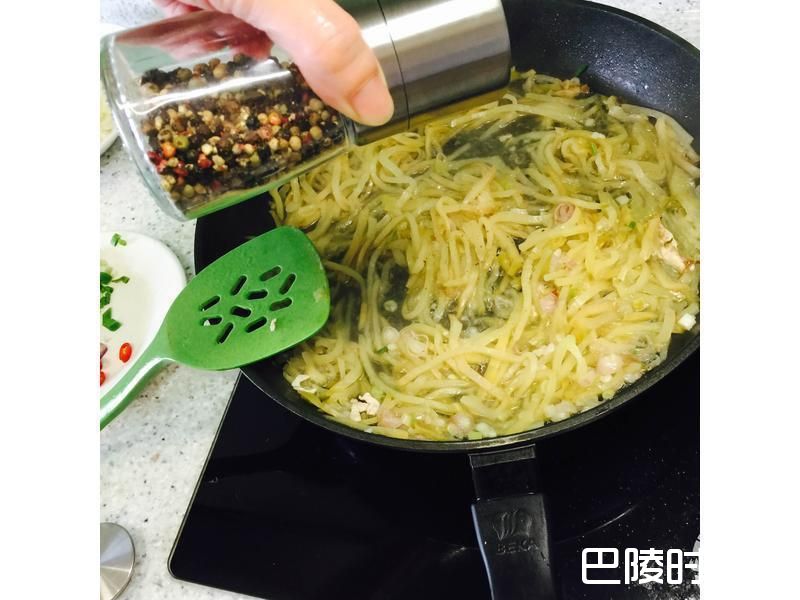 4同锅不放油,丢榨菜加点水下去炒,加点胡椒翻炒一下,直到汤汁收完