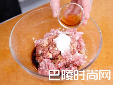 3猪肉糜加入绍兴酒、生抽、生粉、白砂糖及麻油腌20分钟