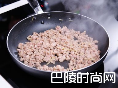 4用中高火烧热锅,加少许油,炒香蒜蓉及姜丝,加入猪肉糜炒至金黄色