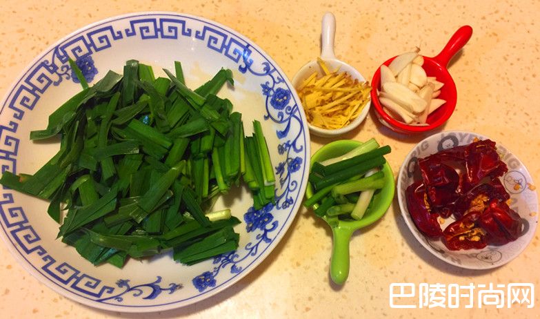 22.韭菜、葱白切段,老姜切丝、大蒜切片,干红辣椒切段备用