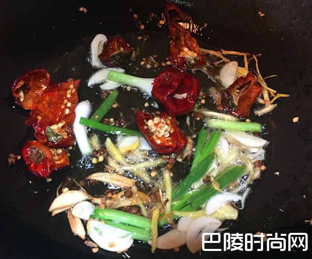 33.锅内倒油烧热至7成时,倒入姜丝、蒜片、干辣椒段、葱白、花椒粒、郫县豆瓣酱爆香锅