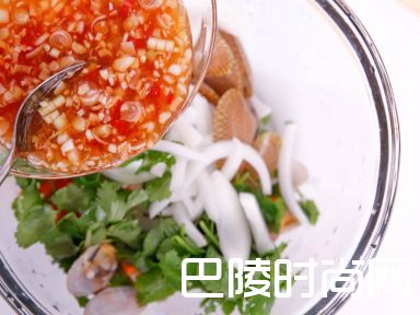 7加入洋葱、红萝卜、芫茜及花甲拌匀