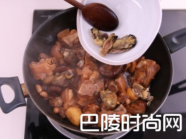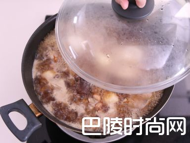 10加入冬菇水及调味料,煮沸,盖上锅盖,将火调至中火,煮2-3小时直至猪手软焾