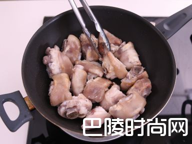 8中高火烧热平底锅,落油,放入猪手煮至呈金黄色