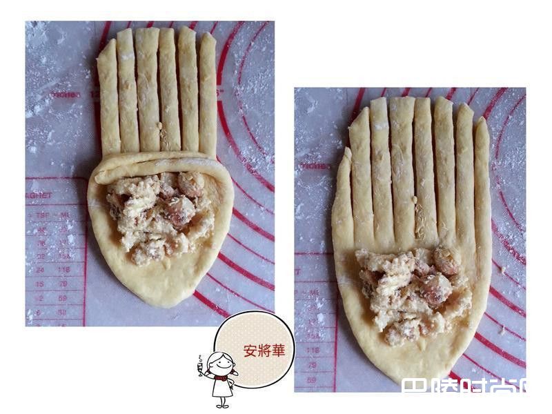 4取适当奶酥馅放在面团前端,尾端处用刮刀板切出8道面条,将左右各一条围在内馅前包住。