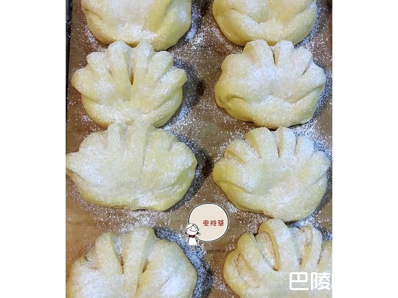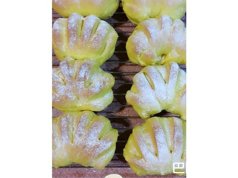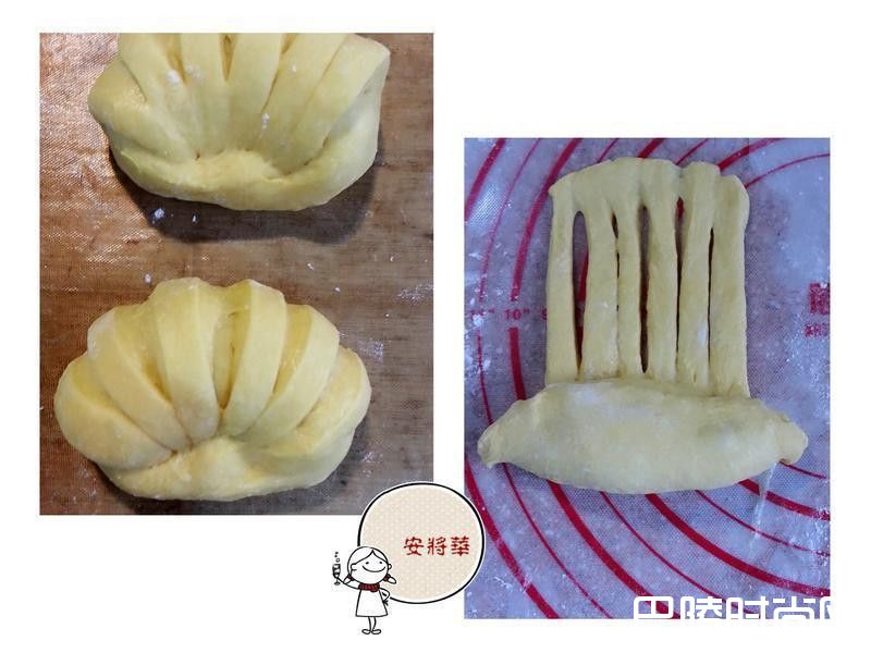 5将面条最尾处压扁,由下往上卷起,卷好将两端收尾处往中间拢合粘紧尽量黏在面包体上成一扇贝形。