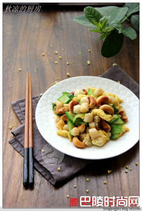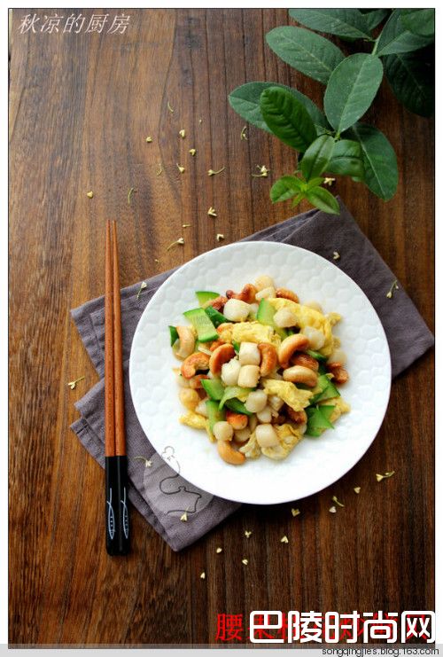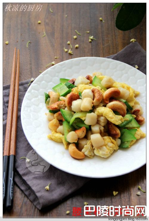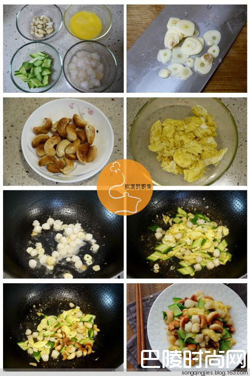 炒一碟清新的家常小菜——腰果桂花炒鲜贝鲜贝150克,鸡蛋一个,腰果20粒,日本小青瓜一条,蒜两瓣,盐适量,料酒一匙。