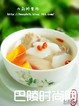 做法1.排骨500g,山药半根,枸杞适量,胡萝卜一根,生姜适量切片,料酒1茶匙,白醋几滴,八角一个,盐适量。