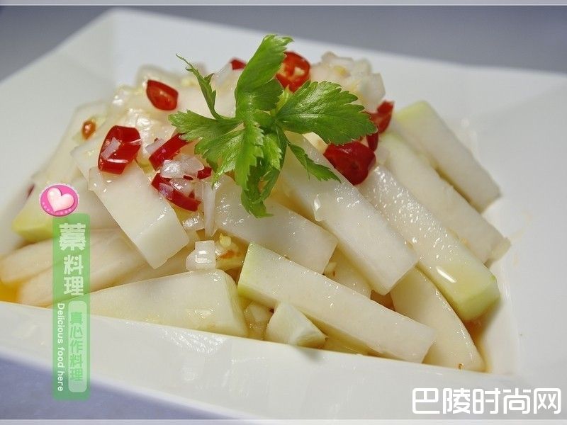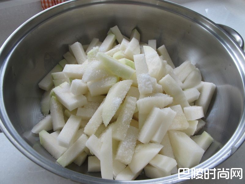 1大头菜去皮切成长条型,加入2匙的盐巴翻ㄧ下,静置10分钟出水,沥干水分备用