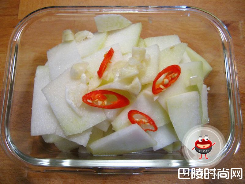 1大头菜削去硬皮,切成薄片;辛香料蒜末和辣椒末也一起放进保鲜盒中,加醃渍料1匙盐醃渍15分钟。
