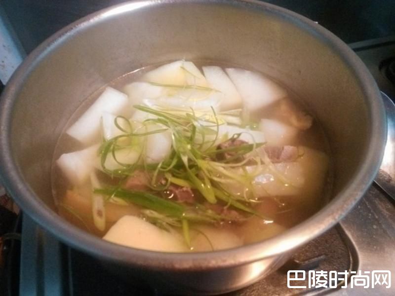 4当汤汁恢复清澈,放入大头菜,并且倒入米酒或是绍兴酒盖上锅盖,将炉火转小火炖煮约20~30分钟。