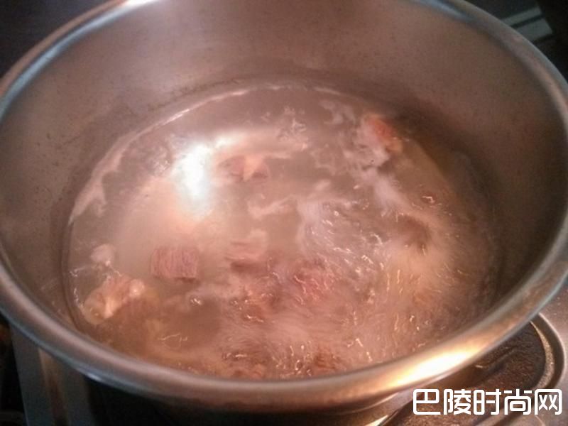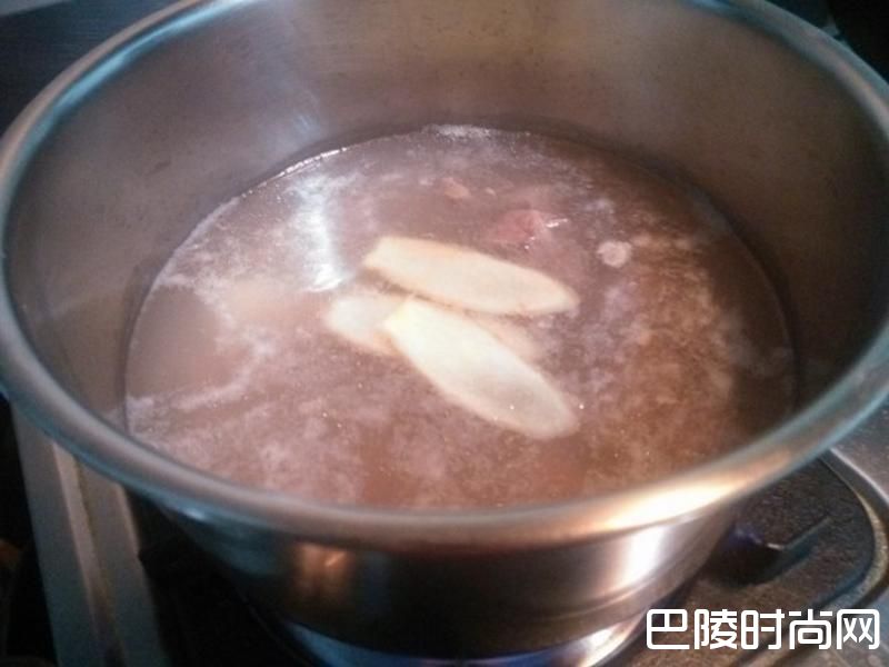 2锅中放入适量的清水或是高汤,水沸腾时将姜片与牛肉放入。