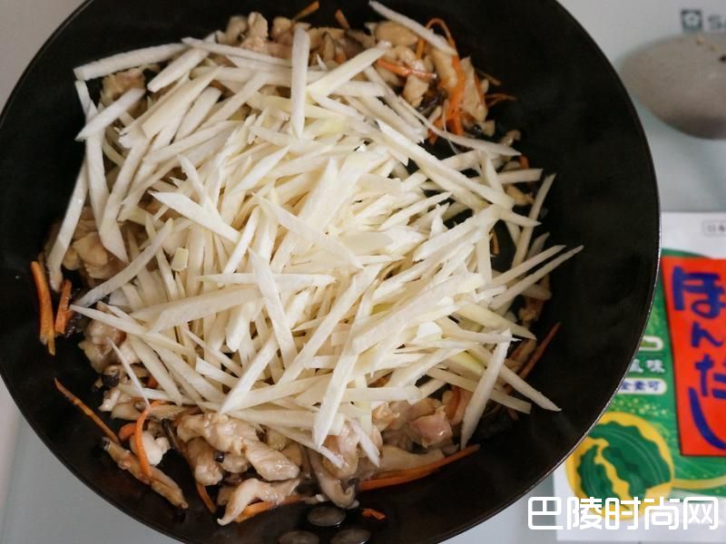 3适量油热锅,将香菇丝、红萝卜丝及醃渍好的鸡肉丝依序下锅炒到肉开始转白色。
