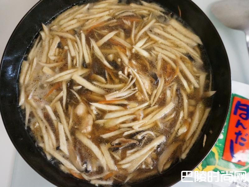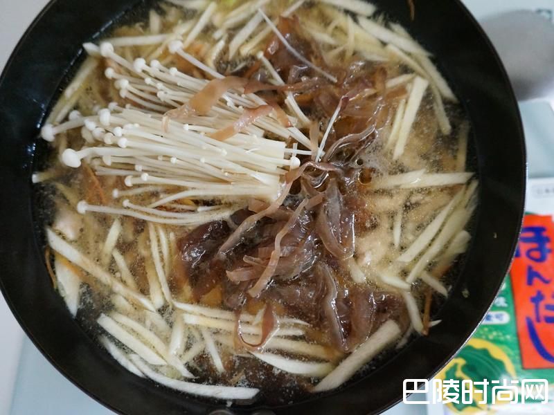 5调味料及水600ml倒入煮滚后再放入黑木耳丝及金针菇煮约1分钟。