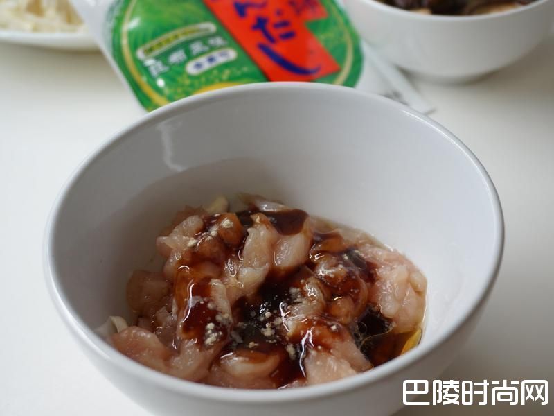 2醃渍料加入鸡肉丝中抓匀。