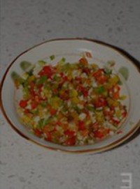 3.彩椒切末和蒜末,加料酒,生抽,香油,黑胡椒,盐和糖拌匀