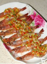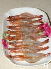 4.将炒锅置于旺火上,放入色拉油,倒入清汤(200克)烧开,用湿淀粉勾芡,淋在对虾上即可。