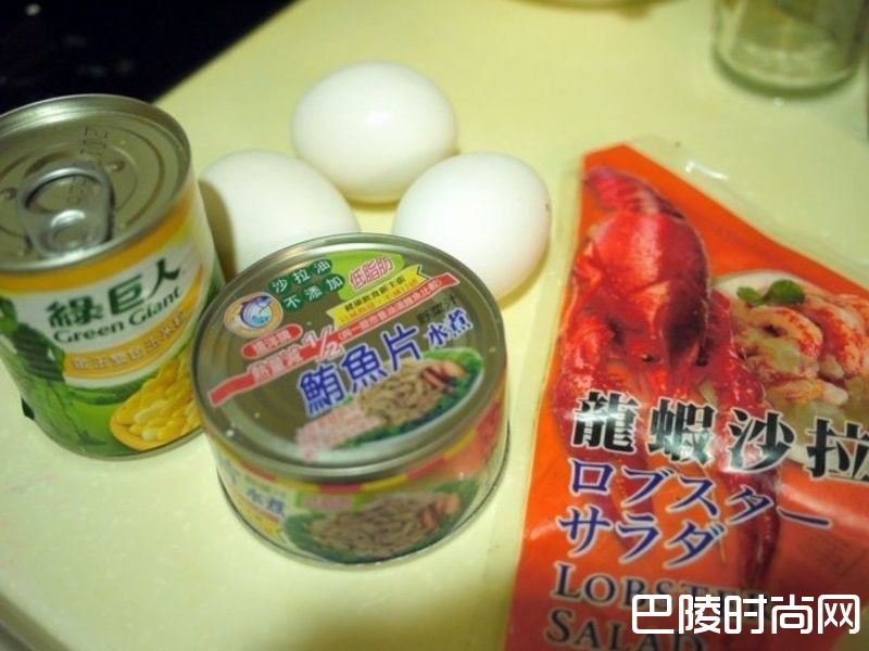 1准备玉米粒、鲔鱼罐(水煮)、3颗蛋、龙虾沙拉(巿售)