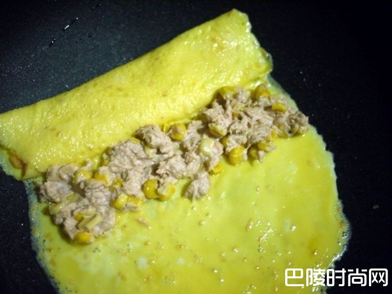 11再加入蛋液,快七分熟,再加入鲔鱼沙拉酱舖平