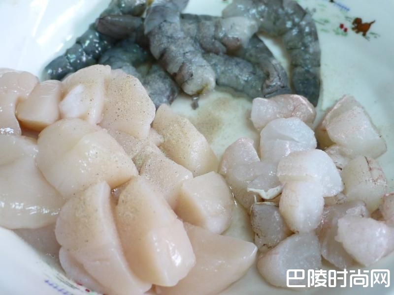 5处理好的鲜虾、干贝与蟹管肉加米酒与白胡椒粉抓云后醃渍约10分钟