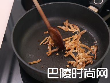4中火烧热平底镬,落油,快炒香蒜头及虾干