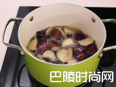 3将油加进浅身锅内,然后炸紫茄子,炸大约1分钟后,捞起放在碟上,把沥干油