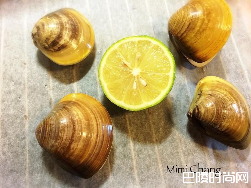 1将大文蛤泡盐水吐沙后洗净,放烤盘中,壳底可放一匙盐稳固,加半颗柠檬一起烤,烤箱预热摄氏200度,放入烤15分钟,或见壳开汁液沸腾即取出。