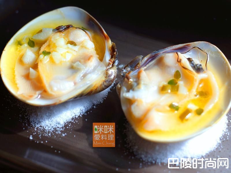 4在盘中各放一大匙盐做为大文蛤的座基,将大文蛤对切后拿掉空壳,放在盐堆上,淋上酱汁,即可上桌。
