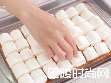 5取出把棉花糖放在薯泥上,每片间隔约1厘米间距。