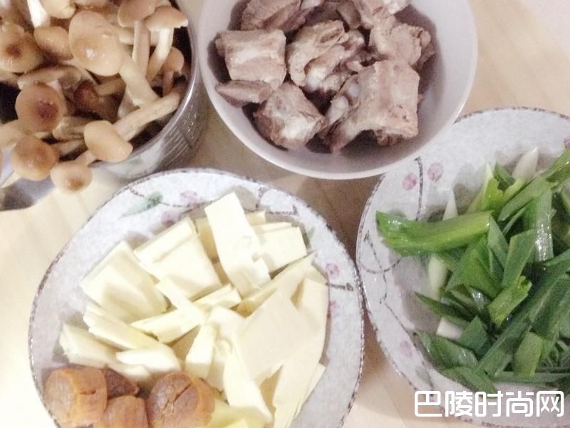 2处理食材。冬笋去壳切薄片/茶树菇去头端洗净/排骨川烫去血水/冲洗干贝 /蒜苗斜切大段。