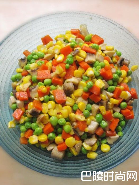 2.豌豆先用沸水氽熟,锅里放油,依次放入胡萝卜丁炒软,接着加入蘑菇玉米丁翻炒,快熟时倒入焯好的豌豆丁,调入盐,鸡精,淋少许湿淀粉勾薄芡即可