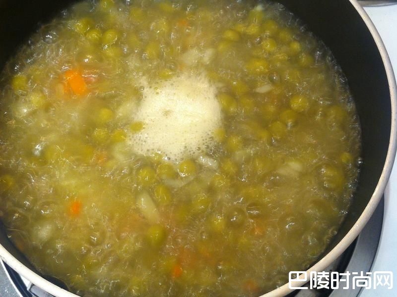 加入豌豆及鸡高汤, 以大火煮滚10分钟后, 转小火加盖煮1小时