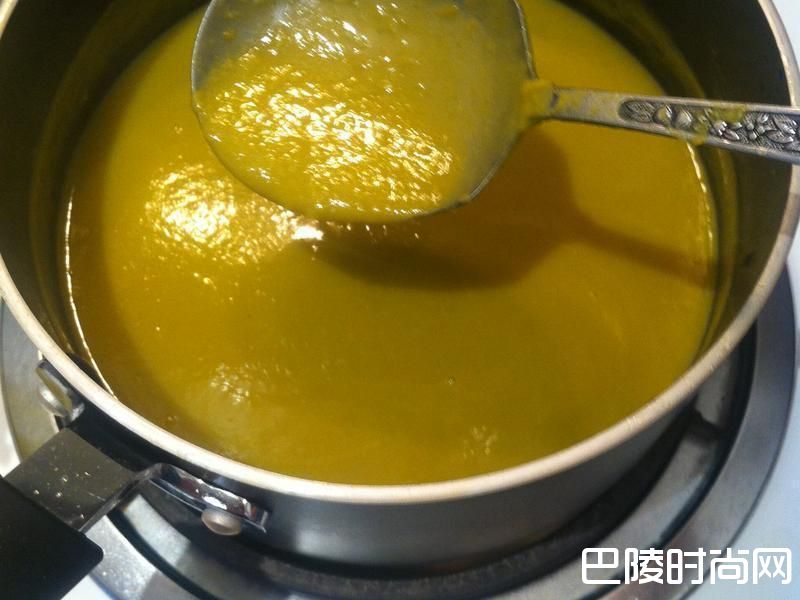 将步骤2用调理机打成泥, 再倒回锅里, 加入牛奶以小火加热, 食用前依喜好洒上洋香菜,海盐,黑胡椒