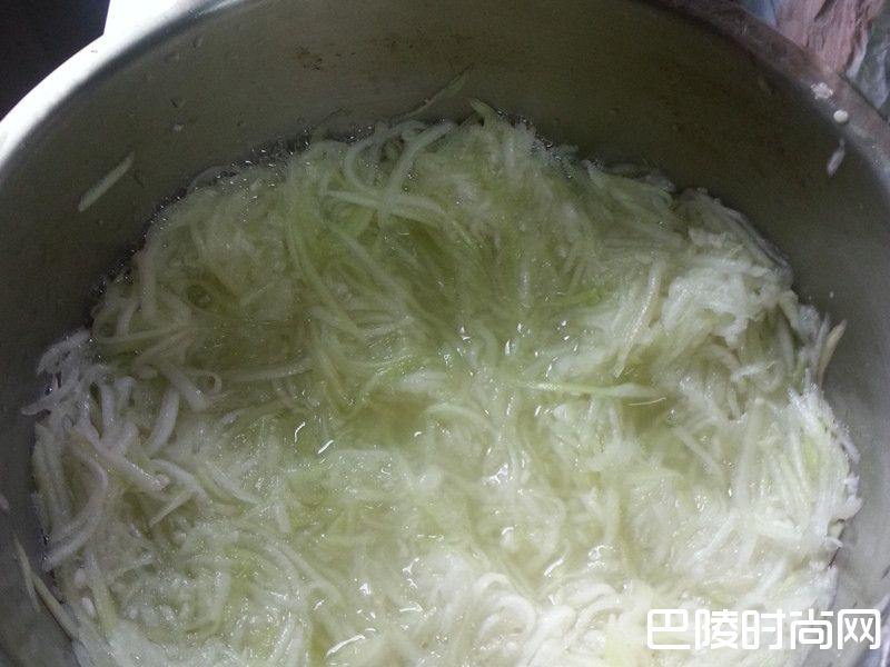 5将瓠瓜刨成丝,加一点盐,静置10分钟,待出水后,将水分去除