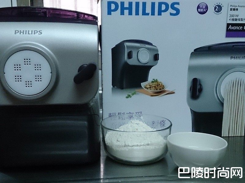 2将中筋面粉倒入飞利浦爱面机(HR2356)盒中,盖上盖子,按下开关键,选择1杯面粉(250g),就可以按开始键,水缓缓从盖子旁边倒入
