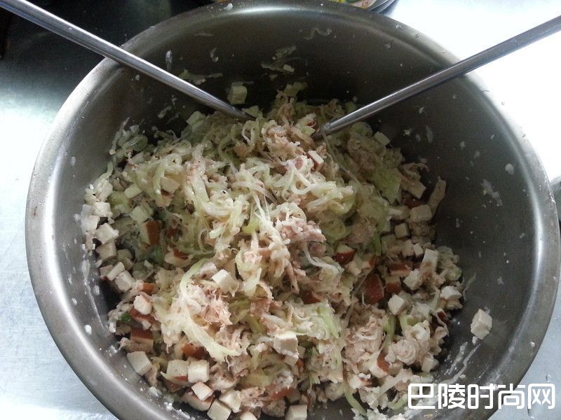 6将素香菇丸子、豆干切成小丁后,连同素香松加入去除水分后的瓠瓜丝中,加一点酱油、盐搅拌均匀