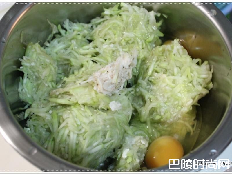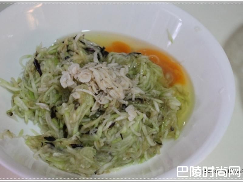 2瓠瓜丝拧干后,加入虾皮、鸡蛋、调味料