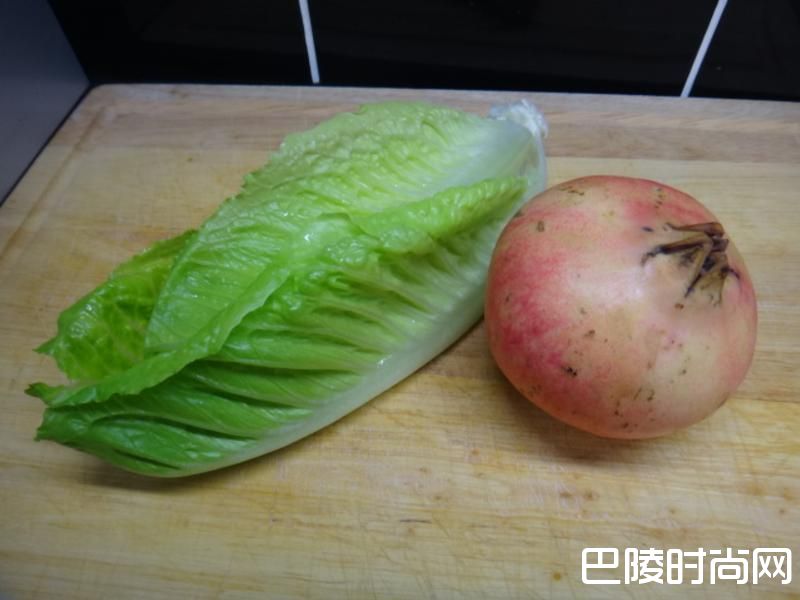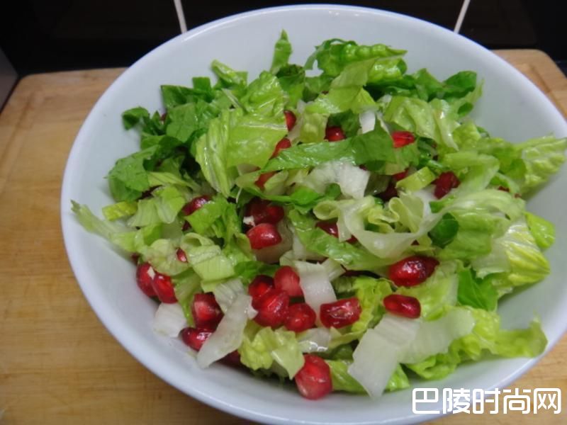 1将切成细丝状萝蔓莴苣和石榴混合。