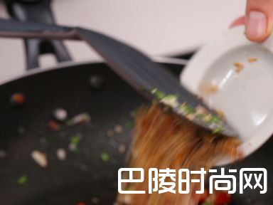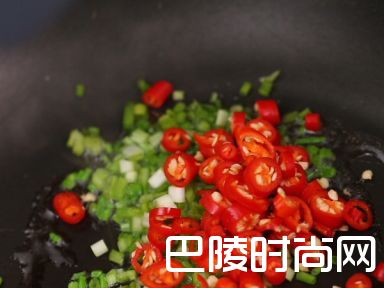 5另起油锅,中火烧热,下小葱、花生、红椒,炒香后。