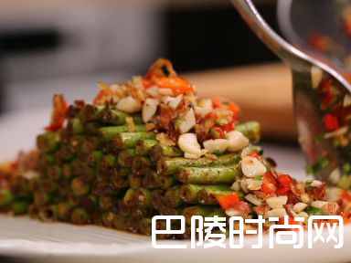 中高火热油锅,爆香蒜末,下豆豉酱、生抽、豇豆翻炒均匀,装盘排整齐。