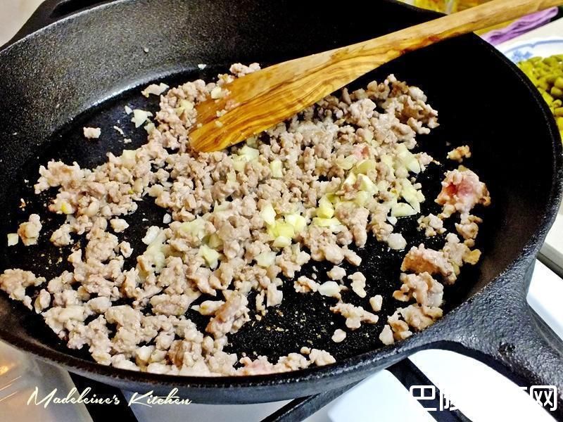 2起油锅~放少许油,绞肉先入锅炒散,煸炒一下油脂释出后,加入蒜末爆香。(ps:这道菜,因为酸豆的关系,所买的绞肉油脂较少的话,可添加少许油一起炒,才不会过于干涩影响口感。)