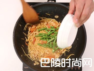 98. 加入豇豆一起翻炒,炒熟盛出即可。