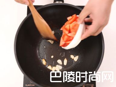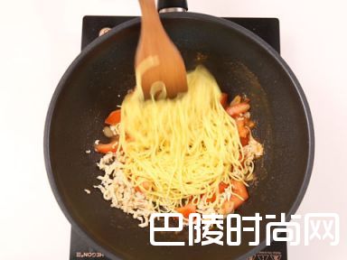 8锅中放入油,放入蒜瓣炒香,加入番茄,加少量水,放入鸡丝和面条翻炒,加入鸡汤,放入生抽和盐
